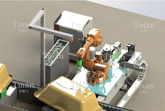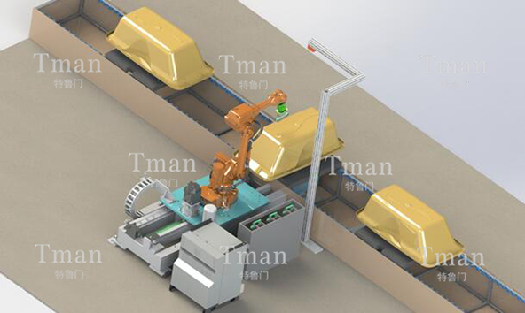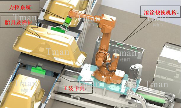 由機器人、旋轉變位機、橫向變位機、力控系統(tǒng)、工裝卡具、自動滾涂快換機構、胎具、電控系統(tǒng)、機器人管線包、機器人防護服等構成。