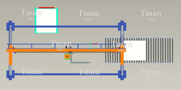 ③整機(jī)具有X、Y、Z三坐標(biāo)垂直軸及Z軸旋轉(zhuǎn)軸。起重Y軸采用雙邊齒輪,集中驅(qū)動(dòng)。