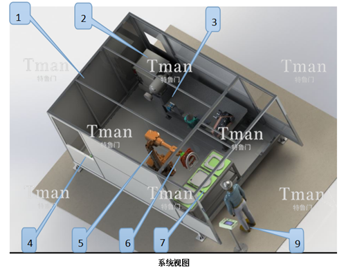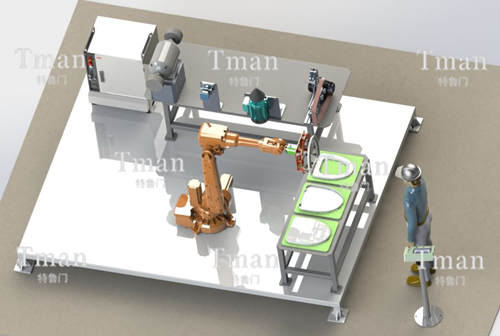 馬桶蓋自動打磨系統(tǒng)由以下幾部分組成:打磨機器人系統(tǒng)、打磨系統(tǒng)、力控系統(tǒng)、工裝夾具系統(tǒng)、主控系統(tǒng)。