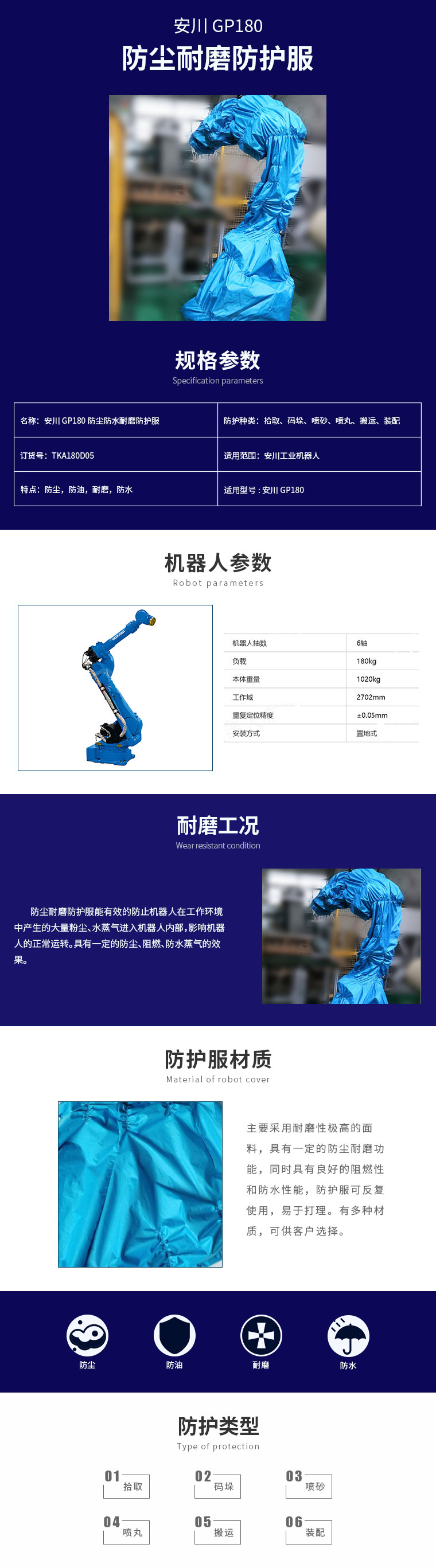 關(guān)鍵詞:機(jī)器人防護(hù)服 防塵耐磨機(jī)器人防護(hù)服 特魯門 truman 安川_GP180_防塵耐磨防護(hù)服 安川防塵耐磨防護(hù)服 TKA180D05